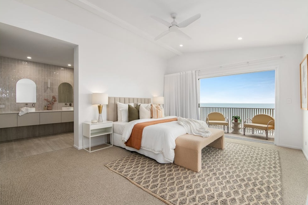 Next door, the 558m² residence at 504 Flinders Parade makes a statement with curved interior detailing, a bar and butler’s pantry, raked ceilings, dual master suites, and oversized windows framing uninterrupted views of Moreton Bay.