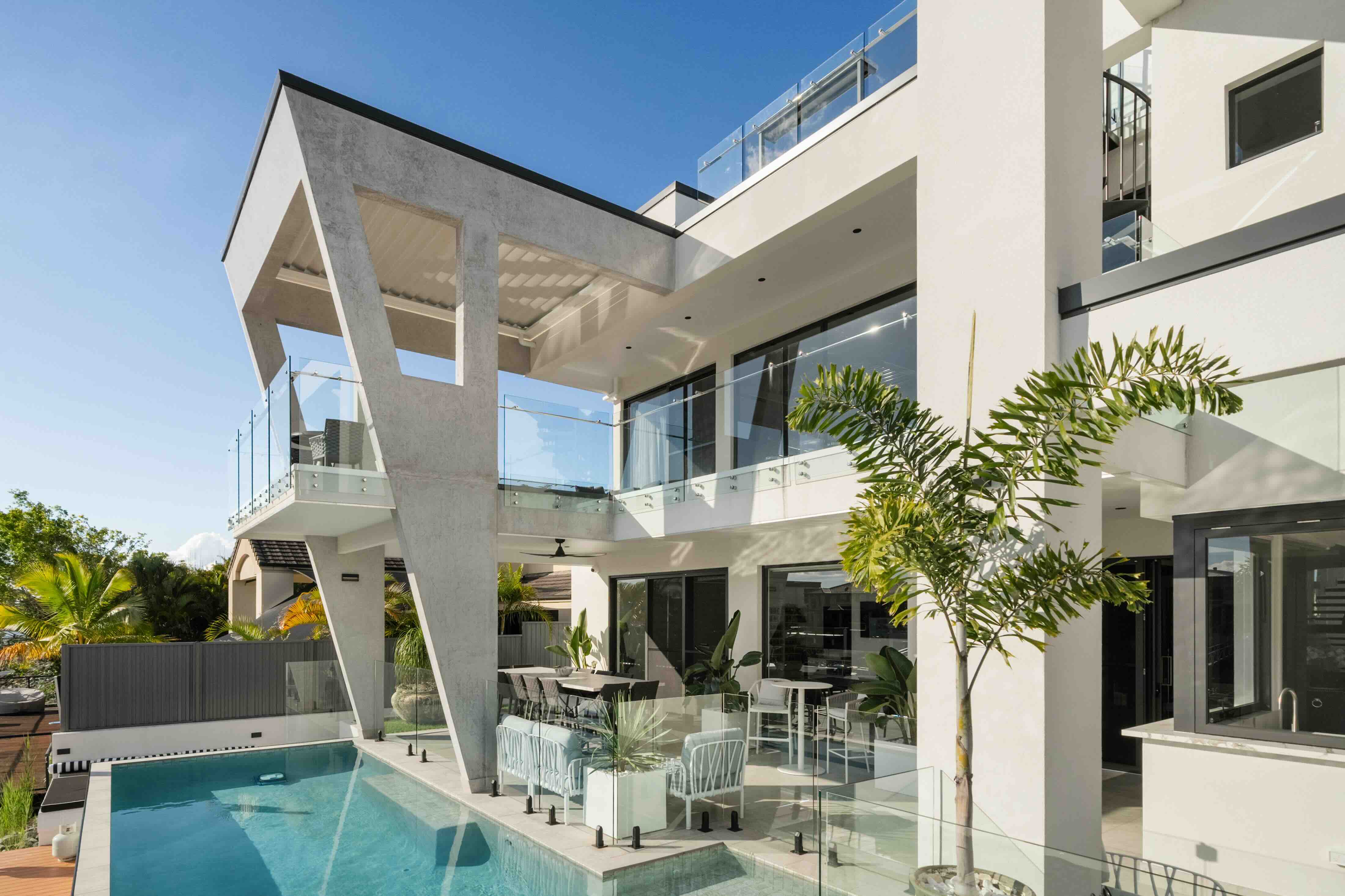 As you enter the high-set house, you will be amazed by the enormous glass pivot door. The entrance area features 6-metre high ceilings, and the one-piece monolithic steel curved staircase provides a stunning view of the Newport canals and the pristine out-of-ground pool.