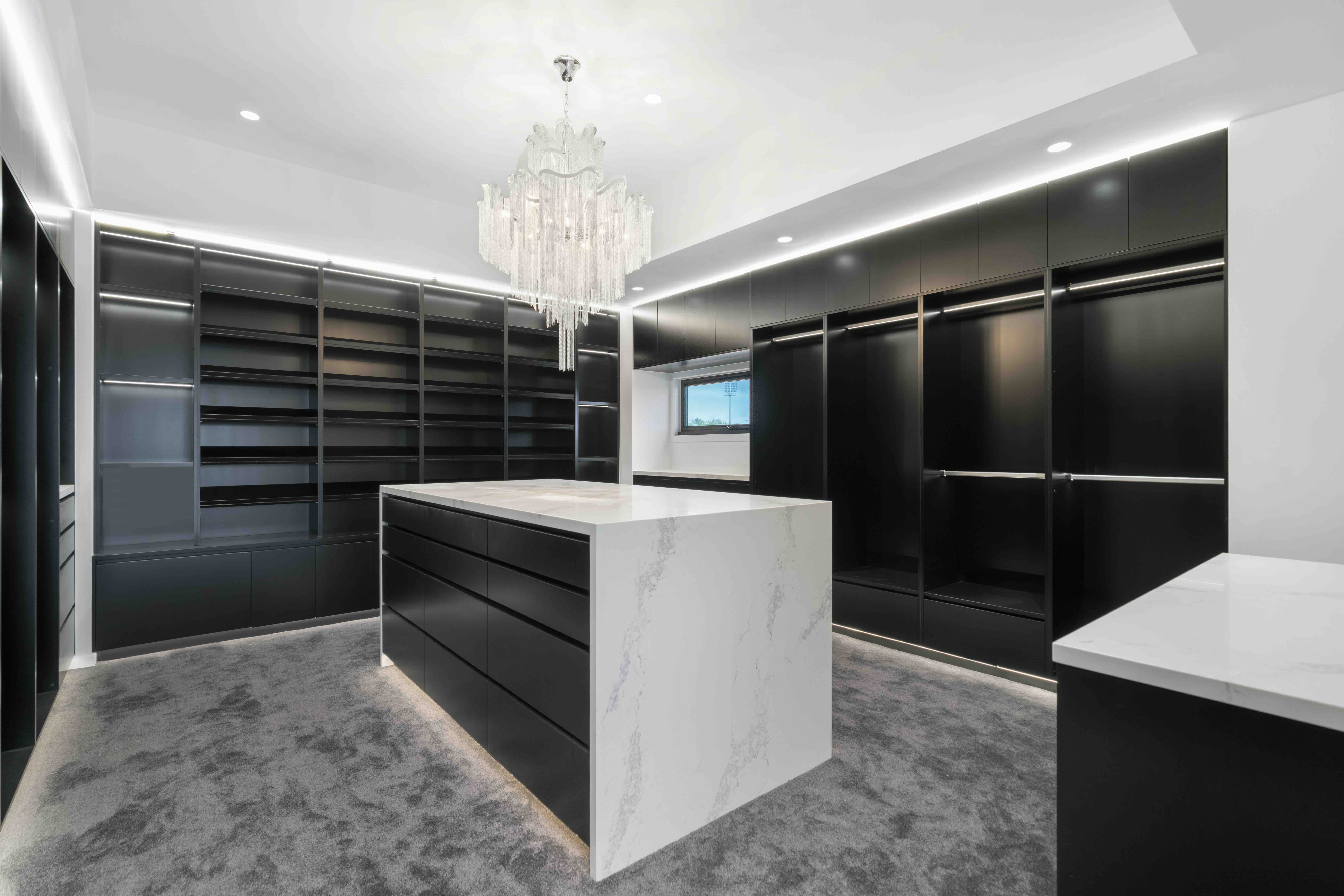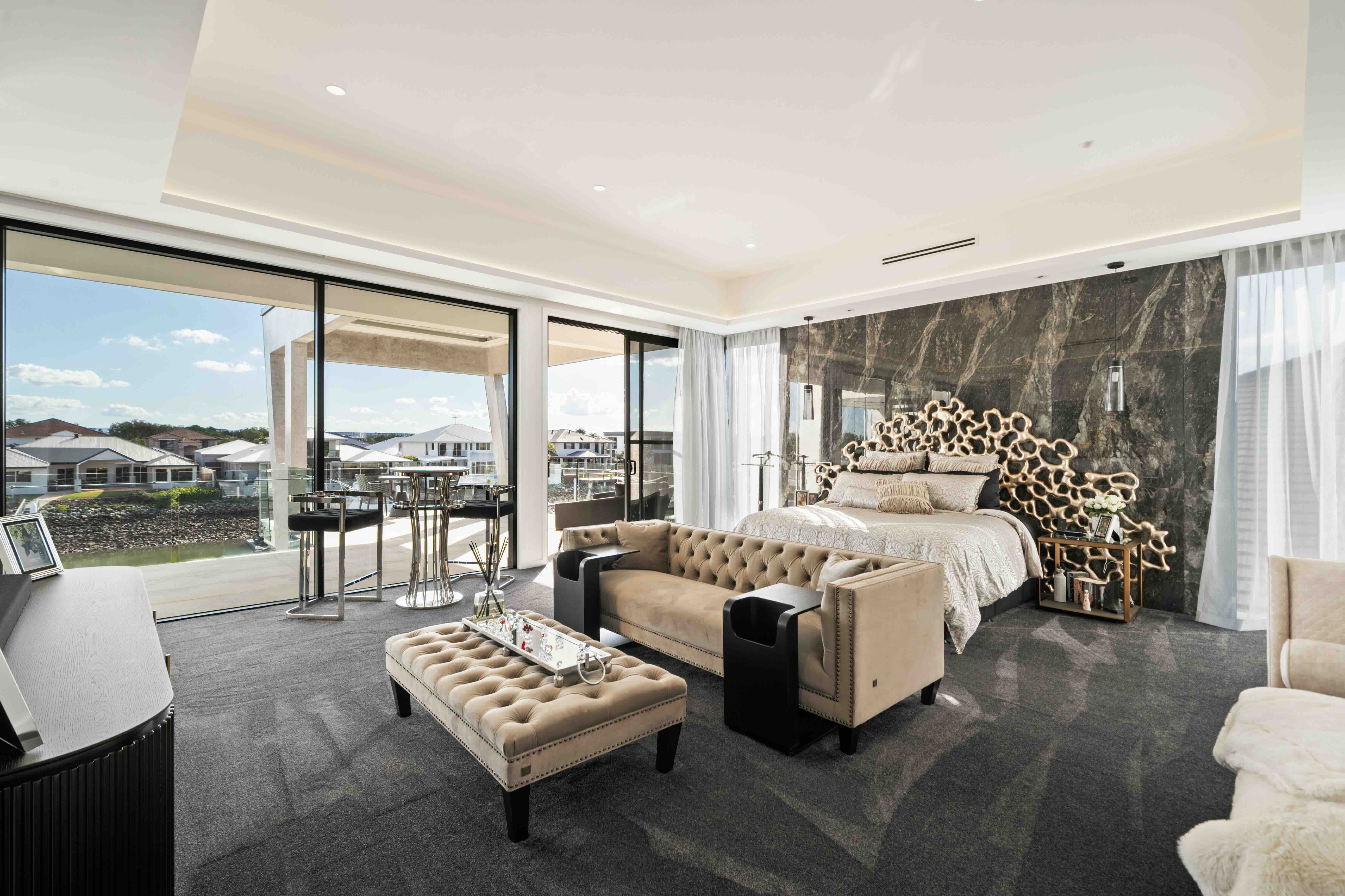 There are custom-designed wrought iron doors into both the home cinema and the mammoth master suite. The master suite has a glass roof above the bath in the ensuite and a walk-in robe as big as a small house, home to custom-designed cabinetry. The 50m2 master patio also has a hidden rooftop that can be accessed by a circular staircase. We can imagine the client enjoying chilled champagne under the stars on a glorious Queensland night.